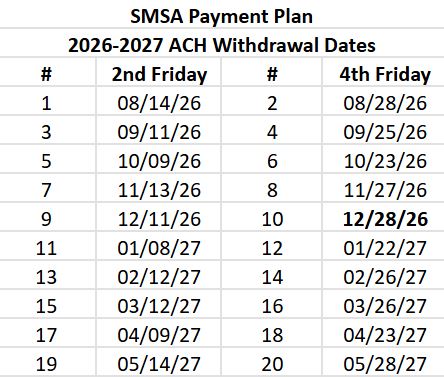 The schedule of ACH withdrawal dates is listed below: