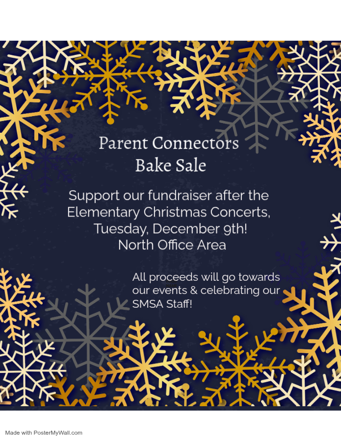 Support our Parent Connectors Bake Sale Fundraiser that will take place after both Elementary Christmas Concerts (1:15 pm & 6:30 pm) on Tuesday, December 9th at the North Office Entrance. All proceeds will be used throughout the school year to offset the cost of our events & show our appreciation towards our SMSA Staff. Thank you for your support!