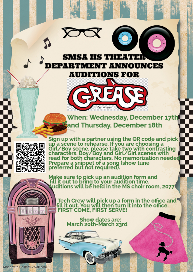 Auditions for GREASE will take place on Wednesday, December 17 & Thursday, December 18, 2025. Sign up with a partner by clicking here, and pick up a scene to rehearse. If you are choosing a Girl/Boy scene, please take two with contrasting characters. Boy/Boy and Girl/Girl scenes with read for both characters. No memorization needed.