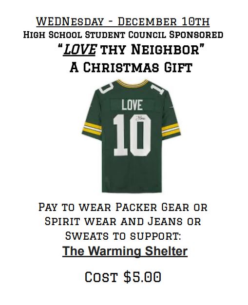 Student Council sponsors “Love” thy neighbor fundraiser. On Wednesday, December 10, 2025 the high school student council will be sponsoring a Packer/spirit wear jean or sweats day. The cost is $5 and all funds will be used to purchase backpacks filled with socks and hygiene products to donated to the warming shelter. Please encourage all students to be generous if possible and help to brighten someone’s Christmas.