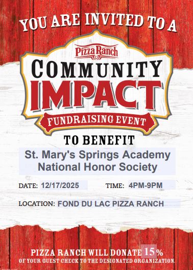 The National Honor Society will be hosting a fundraising event at Pizza Ranch on Wednesday, December 17th from 4 pm to 9pm. Pizza Ranch will donate 15% of the proceeds to our chapter. The funds raised will be used to buy groceries and prepare meals for the homeless in Fond du Lac. Please take a night off from getting the kitchen dirty to support our students and community members.