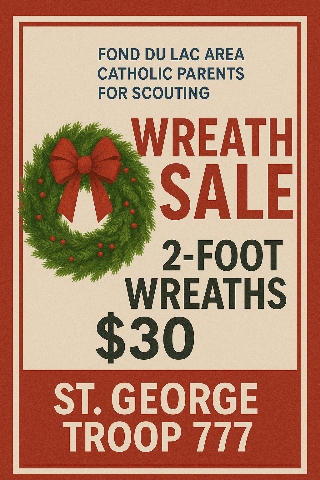 Members of St. George Troop 777, along with members of Fond du Lac Area Catholic Parents for Scouting will be selling 2-foot Christmas wreaths after all Masses at Holy Family Church, St. Mary Church, and St. Peter Church on Saturday, November 29th and Sunday, November 30th. Wreaths will be available on-site after Mass while supplies last for $30 each. Cash and checks will be accepted; please bring exact cash if possible. Donations will also be accepted to support the Troop.