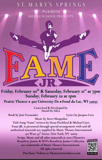 The musical is presented by St. Mary’s Springs Academy Middle School, and directed by Sonya Packer and Michelle O’Brien. All ages are welcome. The shows are Friday, February 20th at 7 pm; Saturday, February 21st at 7 pm; and Sunday, February 22nd at 1 pm. The shows will be performed at Prairie Theatre at 400 University Dr., Fond Du Lac.