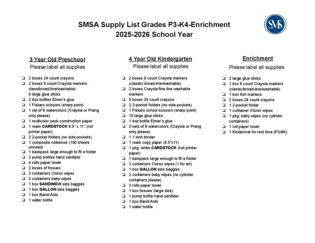 SMSA 2025-26 P3-K4 Supply list